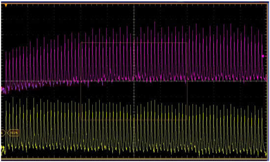The oscillograms of the burst pulse at an 8 kHz Q-switching rate: pink, 532 nm pump radiation; yellow, 589 nm Raman radiation. The frame width is 10 ms.