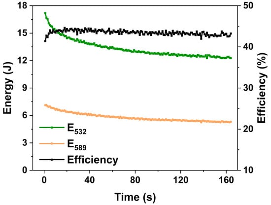 At the same time, we can see that the efficiency of 589 nm generation remains practically unchanged after more than 2 min of laser operation. This means that E589 reduces only in proportion to the reduction in E532, indicating that, for our pumping spot size, the thermo-optical distortions that are created in the KGW crystal during Raman laser generation are actually small, and do not exert a notable additional influence on the Raman laser energy.