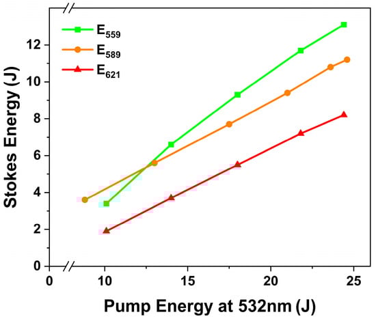 At the maximum 532 nm pump energy E532 = 23 J, we obtained a burst energy E559 = 13 J at 559 nm, E589 = 11.6 J at 589 nm, and E621 = 8 J at 621 nm. This is the first time that such a level of energy in Raman lasers for the visible spectral range has been realized. The maximum energy achieved here at 559 nm is eight times higher than that previously reported in [] for 1180 nm. The maximum energy efficiencies, η, here, are 56%, 50%, and 35% for 559 nm, 589 nm, and 621 nm, respectively.