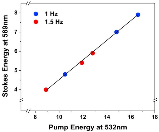 The maximum electric pump energy applied to flash lamps operating in PB mode exceeds 1500 J, so the average pump power, even at 1 Hz, can exceed 1.5 kW. It caused a considerable thermal birefringence in the Nd: YAG laser rods, and the reduction in Nd: YAG laser energy after the start. Correspondingly, the burst energies at 532 nm and all Stokes wavelengths also decreased. The temporal decrease in the burst energy at 532 nm and 589 nm is shown in Figure 4.