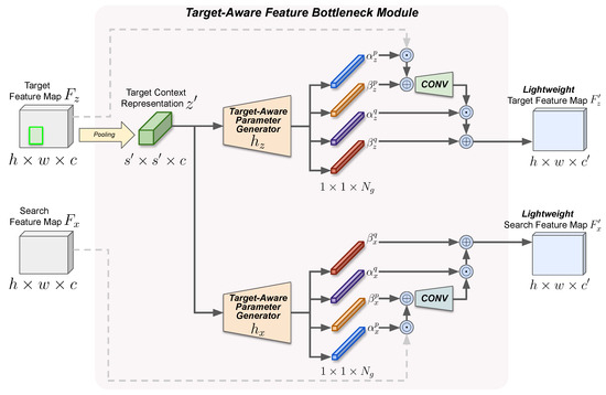 where the output feature maps are and the hyperparameter is chosen for reduced computation. Using lightweight target and search feature maps , the subsequent region proposal (Equation (2)) and classification and refinement (Equation (4)) can be performed with less FLOPs operation, and the amount of reduced computation can vary depending on the architecture of the prediction heads. Our target-aware bottleneck module processes feature maps through three stages, which are the (1) pre-modulation stage, (2) convolution stage, and (3) post-modulation stage. The convolution stage performs a simple point-wise conv operation which reduces the channel size from c to , whereas the pre- and post-modulation stages perform channel-wise feature modulation through affine transformation based on the target-aware information extracted from the target feature representation.