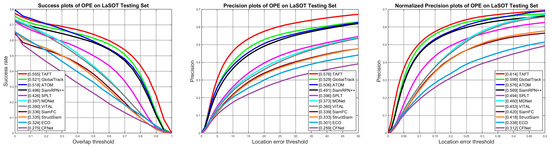 For the experiments, we run our tracking algorithm given the testing split of two benchmark datasets and obtain performance metrics to conduct comparisons with other trackers. When evaluating a performance metric, we use a fixed hyperparameter setting throughout all the sequences in the test split. The large-scale LaSOT [19] benchmark represents a long-term tracking benchmark where it contains mostly long sequences with an average length of 2512 frames, which is equivalent to s under a 30 fps setting. It contains 1400 sequences with 70 target object categories, where 280 sequences are used for testing and the remaining sequences are used for training. Along with the bounding box coordinates, annotations of various challenge attributes such as occlusion, out-of-frame disappearances, motion blur, background clutter, etc., are provided. To evaluate a tracker, three performance metrics are used which are the area under the curve (AUC) of the output success plot, center pixel precision plot, and target-scale normalized pixel precision plot. Success plots and precision plots are generated by varying the threshold values of the IoU and center pixel error.