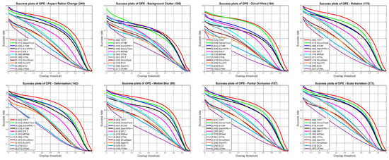 Success plots evaluated under 8 attributes of LaSOT test split. Best viewed zoomed in.