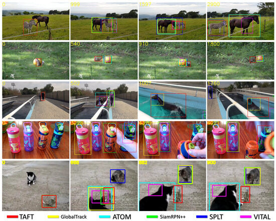 The results for the test split of GOT-10k are shown in Table 2 where all the quantitative metrics are obtained by uploading the outputs for the test sequences to the authors’ online evaluation server (http://got-10k.aitestunion.com (accessed on 8 September 2023)). Our proposed TAFT also shows competitive performance compared to other trackers on the task of relatively short-term sequences, even though our baseline tracker GlobalTrack [29] is a long-term oriented global search-based tracker. Although every other tracker requires meticulous tuning for the hyperparameters regarding temporal smoothness, motion priors, and cosine window weighting, our proposed TAFT does not employ any of these motion priors and thus performs generally well on a wide variety of tracking scenarios. Additionally, because removing the motion prior also removes the dependency between consecutive frames, our tracker can be executed in a batch-wise fashion where multiple frames can be processed at once, enabling further acceleration of the tracking speed.