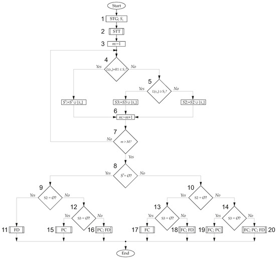If the set is not empty (output “No” from block 8), then the choice is made among four architectures (, , , ). Set S2 is analyzed (block 10). If it is empty (output “Yes” from block 10), then set S3 is analyzed (block 13). If S3 is empty (output “Yes” from block 13), then the FSM PY is selected (block 17). If S3 is not empty (output “No” from block 13), then the FSM is selected (block 18). If set S2 is not empty (output “No” from block 10), then set S3 is analyzed (block 14). If S3 is empty (output “Yes” from block 14), then the FSM is selected (block 19). If S3 is not empty (output “No” from block 14), then the FSM is selected (block 20).