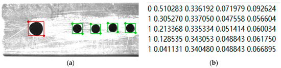 The dataset utilized in this study possessed the following attributes: it consisted of images of four distinct workpieces that were captured for the purpose of target selection. This was to ensure that the proposed method had the capability to detect various trolley codes, thereby demonstrating its adaptability. Additionally, the lighting, lens, and position of the workpiece were consistently modified during the process of image acquisition. This deliberate adjustment resulted in a dataset comprising images with varying light intensities and the target positioned at different distances from the camera. The purpose of this approach was to ensure the method’s adaptability to different illumination conditions and workpieces of varying sizes. The process of manually labeling the large and small holes in all images was conducted using the LabelMe tool. It was ensured that the holes were accurately positioned at the center of the bounding box during the labeling process. The label box used for this purpose was rectangular in shape and categorized into two distinct categories. One category of boxes with red labels designates large holes, while another category of boxes with green labels designates small holes. The corresponding text file was generated, and Figure 3 illustrates the markers present in one image within the dataset.