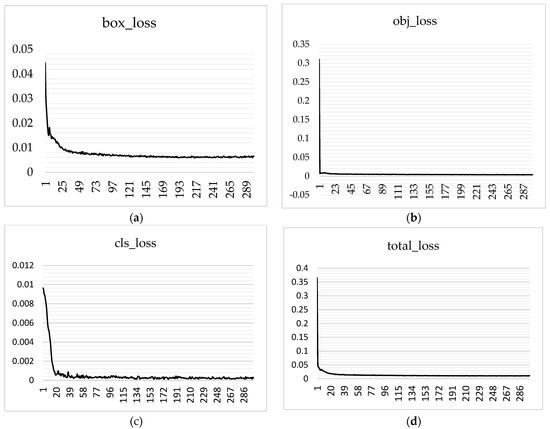 Figure 6 illustrates the loss curves for box_loss, obj_loss, cls_loss, and total_loss throughout the training process. After 300 iterations, the values of box_loss, obj_loss, cls_loss, and total_loss were 0.006604, 0.003979, 0.0002599, and 0.01084, respectively. It is evident from the analysis of Figure 6 that the model demonstrated efficient learning capabilities, as indicated by the rapid convergence of the training curves during the initial stage of training. As the training advanced, the rate of change of the curve gradually diminished. The learning efficiency of the model reached a plateau after 50 iterations.