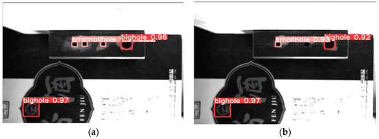 When the light intensity was high, it resulted in a brighter appearance of the workpiece, which had an impact on the accuracy of feature extraction by the model. Conversely, when the light intensity was weak, the image appeared darker, making it challenging to distinguish between the large and small holes due to their similar color to that of the workpiece. This further complicated the process of feature extraction. Figure 12 presents the outcomes of code-based detection using the proposed method across varying levels of light intensity. Figure 12a,b demonstrate the successful identification of both small and large holes.