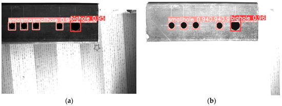 When the camera-to-target distance varied between 15 cm and 25 cm, the proposed method successfully detected both large and small holes. When the distance was increased to 30 cm, erroneous decisions were made. In Figure 11a, the hole pattern located in the bottom left corner is identified as a large hole. Similarly, in Figure 11b, the pattern in the same corner is erroneously identified as both a large hole and a small hole in the workpiece is overlooked. The primary factor contributing to this issue is the significant shooting distance. At such distances, the small holes and the background exhibit similar color characteristics, while the large hole features resemble the hole pattern features of the background plate. Consequently, this similarity poses challenges in extracting the relevant features, ultimately resulting in the missed detection of certain large and small holes.