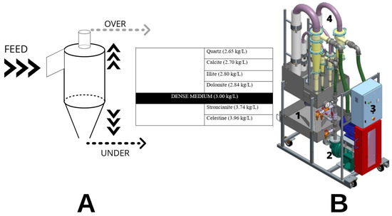 (A) Hydrocyclone system used for the mineral separation and concentration process. The table shows the distribution of mineral phases that can be recovered in the two output streams (UNDER and OVER). (B) Pilot plant used for the experiments, with the main parts indicated with numbers (1—sump, 2—pump, 3—electric control cabinet, 4—hydrocyclone).
