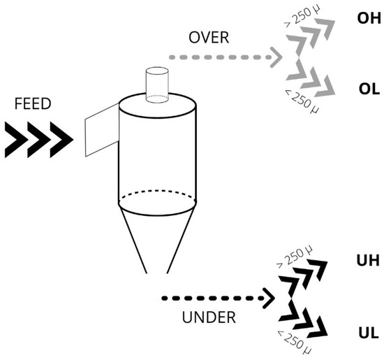 Hydrocyclone system and the type of samples recovered in the two output streams (under (U), over (O). The mineral was then separated by sieving into two fractions with different particle sizes (higher (H) or lower (L) than 250 µm).