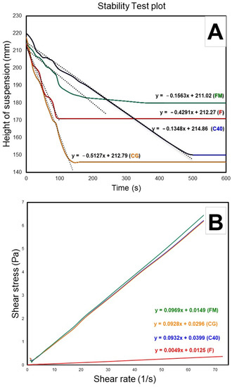 The stability of the suspensions was measured from the settling velocity using the method described in Section 2.3.2. Figure 3A shows how the height of the suspension changes as a function of time. The stability value is calculated from the slope of these curves. When comparing the plots for the different ferrosilicon suspensions (CG, F, C40), one can see how the stability of the media decreases (slope increases in absolute value) as the particle size increases. On the other hand, the suspension containing magnetite (FM; 33% magnetite) has a much slower settling rate than that of pure ferrosilicon (F, CG, C40). This indicates that the addition of magnetite (with more irregularly shaped particles) to the ferrosilicon (with more spherical particles) suspension increases its stability. Therefore, to increase or maintain the stability of the suspension, fine particle minerals (e.g., bentonite) should be added to the coarser heavy mineral to reduce the settling velocity of the media [33]. These results are consistent with those of other authors [33,34,35]. Thus, the FM mixture performs better than suspensions with only ferrosilicon. Additionally, the use of dispersants and/or magnetic dopants could be alternative ways to improve the stability of the suspension [33,36,37].