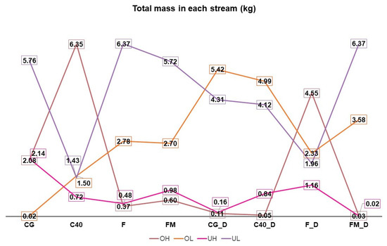 The mineral mass recovered in the UH stream (containing the coarse (>250 µm) and more dense mineral particles) is highest in the CG, F, FM, and FM_D tests. As expected, desliming the run-of-mine mineral decreases the mineral mass in the OL stream (containing finer, <250 µm, and less dense mineral) and increases the mineral mass obtained in the output OH stream (except for the experiment using F medium).