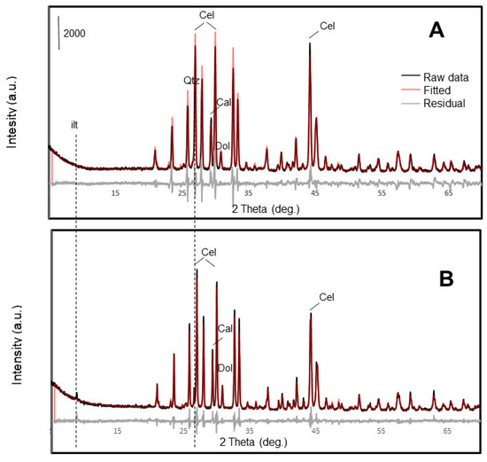 The samples were measured in reflection mode using copper radiation (from 4° to 120° with a 0.017° step size and 100 s integration time by step). The identification of the main mineral phases presents in the samples (celestine, strontianite, barite, Mg-calcite, dolomite, quartz, kaolinite, illite, paragonite) and the corresponding quantitative analysis of weight percentages were performed using the Rietveld method with TOPAS software v.5 (Bruker, Billerica, MA, USA).