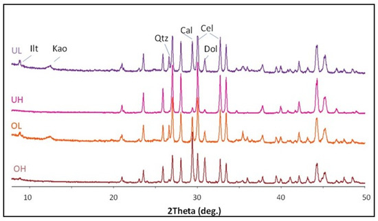 Comparative XRD patterns of samples collected from the over (OH, OL) and under (UH, UL) streams with C40 dense medium that have a particle size higher (H) or lower (L) than 250 µm. Illite (Ilt); celestine (Cel); calcite (Cal); quartz (Qtz).