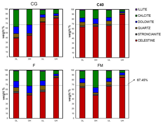 Figure 7 and Figure S6 show the distribution of the mineral phases present in the OL, OH, UL, and UH samples recovered after the concentration process. In the experiments using the CG medium, the mineral recovered from the under stream (UL and UH) has a significantly higher concentration of celestine than that recovered from the over stream. This demonstrates the efficiency of the density separation process and that heavier celestine particles are preferentially drawn into the underflow streams. For the other media suspension, the results are more variable. Nevertheless, in all cases, the highest concentration of celestine was obtained in the UH stream (under stream and larger particle size fraction, above 250 µm). In the experiments using the C40 dense medium, the percentage of celestine obtained in the over streams (OH and OL) and UL stream is very similar (differing by less than 2%) (OH: 63.51% celestine; OL: 64.64% celestine; UL: 66.36% celestine). When CG, F and FM media are used, the percentage of celestine in the OH and OL streams are lower than the corresponding percentages in the under streams.