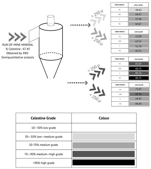 Figure 8 and Figure S7 show the concentration/percentage of celestine (main phase detected) for each output stream (over O or under U) with particle sizes higher (H) or lower (L) than 250 µm, without considering the total mineral mass recovered. The concentration of celestine is shown using a grey scale and the increasing celestine concentration is shown as a darker colour.