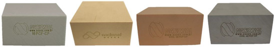 The investigation compared the strength values related to IT and RT of Test and Control implants, as well as the ISQ values, when inserted into polyurethane foam blocks of different sizes and densities. To achieve this, the authors selected different types of solid rigid polyurethane foam (Nacional Ossos, São Paulo, Brazil) with consistent dimensions (97 mm × 100 mm × 50 mm) and homogeneous densities. The chosen polyurethane foam densities were 10, 20, 30, and 40 PCF, corresponding to densities of 0.16, 0.32, 0.48, and 0.96 g/cm3, respectively [19] (Figure 3).