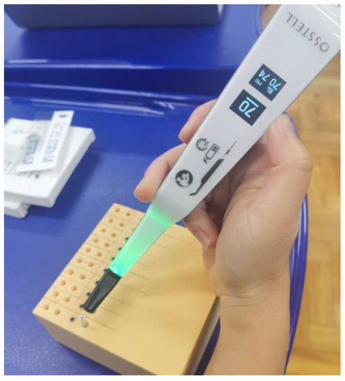 Consequently, following implant insertion, dental implant PS was determined by calculating ISQ using hand-screwed Smart-Pegs (Osstell Mentor Device, Integration Diagnostic AB, Savadelen, Sweden) placed in the abutment-joint chamber. ISQ values ranged from 0 to 100 (measured between 3500 and 85,000 Hz) and were categorized as low (less than 60 ISQ), medium (60–70 ISQ), and high stability (more than 70 ISQ). Two RFA measurements were taken for each specimen, with measurements performed at two different orientations separated by a 90° angle (Bucco-Lingual: BL and Mesio-Distal: MD), and the average ISQ value was computed (Figure 6).