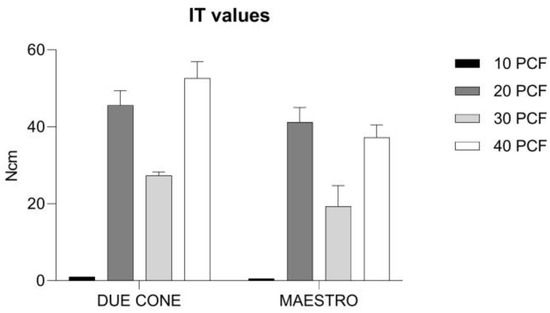 The IT values of Due Cone implants were significantly higher than those of Maestro implants in 30 PCF (27.40 ± 0.89 Ncm and 19.30 ± 5.4 Ncm, respectively, with a p < 0.05) and 40 PCF (52.60 ± 4.34 Ncm and 37.20 ± 3.35 Ncm, respectively, with a p < 0.0001) density blocks. Conversely, no statistically significant differences were observed in 10 and 20 PCF density blocks between the two implant types. The lowest IT values were recorded in the 10 PCF density block for both implants (1.00 ± 0.01 and 0.50 ± 0.01 Ncm for Due Cone and Maestro implants, respectively), resulting in significantly lower than all other density blocks (p < 0.0001). The highest IT values were detected in the 40 PCF density block for Due Cone implants (52.60 ± 4.34 Ncm) and the 20 PCF density block for Maestro implants (41.20 ± 3.83 Ncm), resulting in significantly different with a p < 0.001. The highest Due Cone implants’ IT values significantly surpassed values reported in the 10, 20, and 30 PCF density blocks (p < 0.0001, p < 0.05, and p < 0.0001, respectively), while those of Maestro implants only with respect to 10 and 30 PCF density blocks (p < 0.0001). However, the IT values registered for Maestro implants in the 20 PCF density block did not display a significant difference compared to IT values in the 40 PCF density block (41.20 ± 3.83 Ncm and 37.20 ± 3.35 Ncm, respectively). A statistically significant difference was also found between 20 and 30 PCF density blocks for both implants (45.60 ± 3.85 Ncm and 27.40 ± 0.89 Ncm, respectively, with a p < 0.0001 for Due Cone implants; 41.20 ± 3.83 Ncm and 19.30 ± 5.43 Ncm, respectively, with a p < 0.0001 for Maestro implants) (Figure 7). Confidence Intervals (CI) and p-values for each intergroup comparison are provided in Table 1.