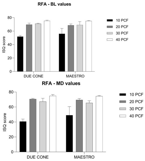 Contrarily, no differences were found when comparing the highest values to those of the same implants inserted into 20 and 30 PCF density blocks. Specifically, in the BL orientation Due Cone implants expressed 69.60 ± 2.30 ISQ and 71.00 ± 0.71 ISQ, respectively, while Maestro implants were 68.60 ± 2.07 ISQ and 69.20 ± 4.97 ISQ, respectively. In the MD orientation Due Cone implants expressed 70.60 ± 0.89 ISQ and 6.20 ± 4.44 ISQ, respectively, while Maestro implants were 69.40 ± 1.95 ISQ and 65.40 ± 2.97 ISQ, respectively.