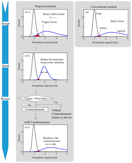 To keep the probability of failure in the conventional method under the target value based only on geotechnical surveys, a safety margin (i.e., safety factor) is set, for example, 3.0 (Figure 2b). Failure is defined here as the capacity being lower than the load. However, if a lower SF—for example, 2.4—is applied in the proposed method (Figure 2(a-1)), the probability of failure is naturally larger than the target.