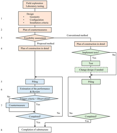 In the conventional method, when it is difficult to estimate the capacity and the uncertainty of the capacity is larger than usual, on-site tests (e.g., pile load tests) should be conducted, after which the piles are re-designed. The case with load tests is excluded in this paper, assuming that the number of piles is small enough.