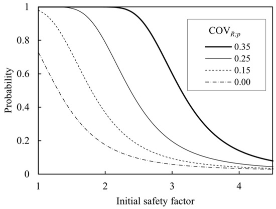 Example of probability of countermeasure (COVR;c = 0.35, COVQ = 0.10, βT = 3.0). COVR;c and COVR;p are COV of the capacity estimation by the conventional and proposed methods, respectively.
