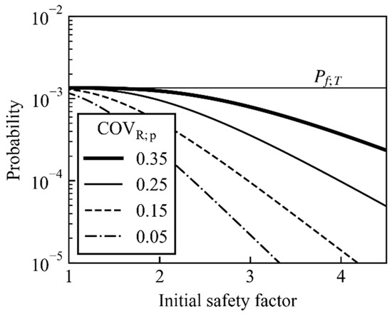 Figure 5 shows the Pf based on Equations (10)–(12), assuming that COVR;c = 0.35, COVQ = 0.10, and βT = 3.0. When the initial SF is low, CMs are implemented in most cases, and Pf approaches the target probability, Pf;T (≈10−3). When the initial SF is high, Pf becomes inversely proportional to the initial SF, and is lower than Pf;T. Thus, the proposed method always has a lower probability of failure than the target value.