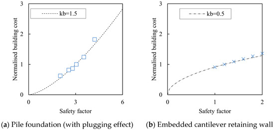 Figure 6 shows examples of cost estimations for open-ended steel pipe pile foundations [54] and steel pipe pile-retaining walls [55]. As the cost estimations conform to the function with the constant power, kb, of the SF (Figure 6), this paper assumes that the normalized Cb is modeled as follows: