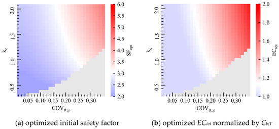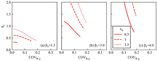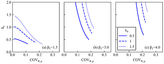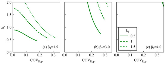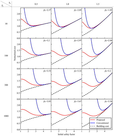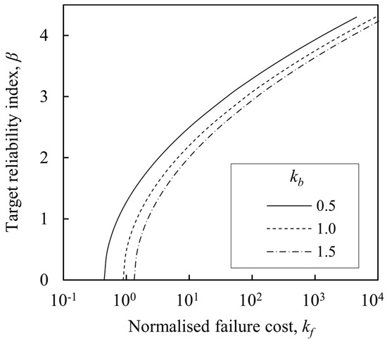 Figure 7 shows the relationship between the normalized failure cost, kf, and β. Equation (16) clearly shows that β is more strongly affected by kf than by kb. If COVR = 0.35, COVQ = 0.10, kb = 1.0, and kf = 80, βT comes to around 3.0. As the range of βT = 0.0–4.3 [44] is roughly consistent with the range of kf indicated by [60], the above assumption seems reasonable.