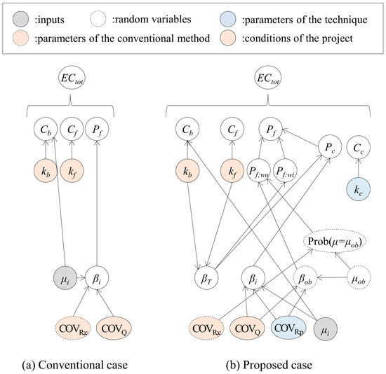 where I is the vector of input {μi}, K is the vector of parameters {kb, kc, kf}, and V is the vector of variability {COVQ, COVR;c, COVR;p}. Figure 8 shows the relationship among the parameters, which differs between the management options—that is, the proposed and conventional cases.