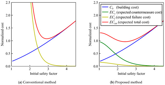 Figure 9 describes how the normalized expected costs change with the initial safety factor (SF). In the conventional method, the expected total cost, ECtot, is a downward convex function of the SF and has a minimal value [50]. It is mostly consistent with the building cost with a high SF, while the expected failure cost accounts for most of the expected total cost with a low SF. In this case, the optimized SF becomes 3.0.
