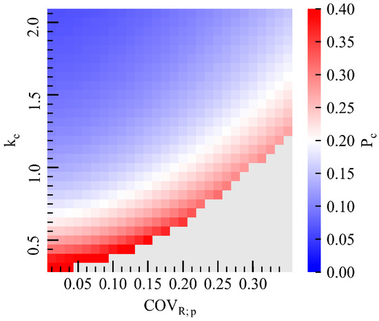 Figure 4 shows the probability of the CM based on Equation (9) when COVR;c = 0.35, COVQ = 0.10, and βT = 3.0, with reference to the findings [32,44,49], respectively. COVR;p = 0.35 requires 60% of the countermeasures even at SF = 3. This is because safety measures were taken due to the misinformation from highly varied estimates. In the paper below, the optimized SF ranges between 2 and 3, wherein it can be observed that the Pc decreases rapidly from a COVR;p of 0.25 to 0.15.