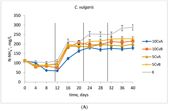From the fourth to the twelfth day of the study, in wastewater inoculated with microalgae (without clinoptilolite) (Figure 1A,B) at a dose of 100 and 50 g/L (samples: 10CvA/10ScA, 10CvB/10ScB, 5CvA/5ScA, and 5CvB/5ScB), regardless of the form of their occurrence, the concentrations of ammonium nitrogen varied within a range of 59–100, 76–101, 87–101, and 83–101 mg N-NH4+/L, respectively. At that time, the concentration of ammonium nitrogen in the control samples was 102–112 mg N-NH4+/L.