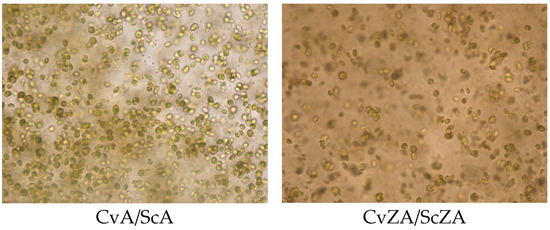 The sewage sludges are uniform and consist of sorbent residues. The locations of microalgae in clinoptilolite are shown as green, round-shaped particles. In the structure of sludge containing immobilized microalgae, a much higher cell density is visible compared to sludge with microalgae in the form of a suspension. These results are in agreement with the literature that states that the immobilizing of algae results in the obtaining of a several times greater biomass than the suspended system [26,27]. Therefore microalgae immobilized in alginate are proposed for removal of contaminants and easier biomass harvesting [28].