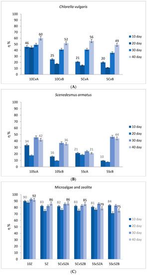 Zeolite with immobilized C.vulgaris reached ηN of 10.3 ± 0.09 mg/L d and with S. armatus achieved a value for ηN of 21.9 ± 0.2 mg/L d, while zeolite with C.vulgaris suspended achieved a value for ηN of 10.2 ± 0.02 mg/L d and with S. armatus achieved a value for ηN of 39.2 ± 0.1 mg/L d.