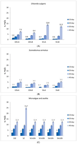 Sorption capacity of sorbents: (A)—C. vulgaris, (B)—S. armatus, (C)—microalgae and zeolite.