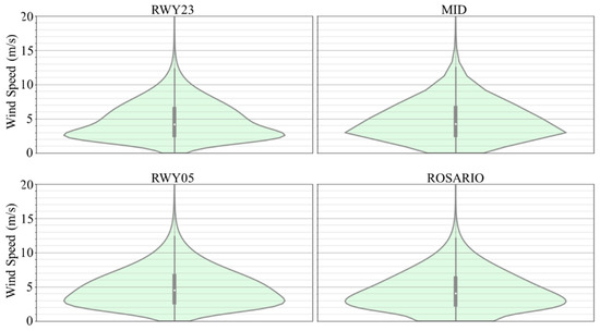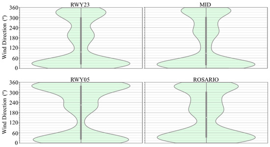 Wind observations at Madeira Airport are recorded by a wind set from Väisälä, model WA15, comprised of a Väisälä Anemometer WAA151 and a Väisälä Wind Vane WAV151. This system is deployed in four different sites, one at the short-final of runway 05 (ROSARIO) and three others at different sectors of the airport: RWY05, MID, and RWY23, as illustrated in Figure 1. In their unprocessed form, collected data are captured every three seconds and stored on a server in a comma-separated values (CSV) format. This format includes a timestamp, the wind speed expressed in m/s, and the wind direction in degrees.