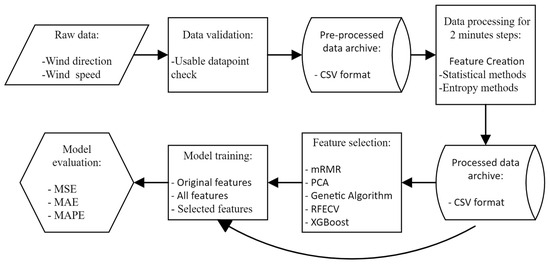 In this section, the research methodology employed is presented, emphasizing the major steps followed to analyze the more important features in wind nowcasting. The prediction process was based on feeding the model with the last 2 min of data for predicting the targeted 2 min, 10 min, and 20 min values, corresponding to the next step, 5 steps, and 10 steps of the dataset, respectively. Specifically, the 2 min and 10 min durations are defined by the World Meteorological Organization (WMO) for local and international wind reports, respectively, while the 20 min duration is drawn from the timeframes used in previous wind nowcasting studies [2,26,27]. A concise illustration of the stages followed in this work is provided in Figure 4.