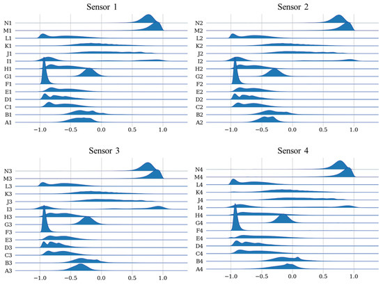 This section presents the attained results. After the preprocessing and feature creation steps, 14 distinct variables were computed for each sensor, aggregating to 56 features. For each sensor, the 14 derived features—[Wind U Component, Wind V Component, Maximum Instant Wind Speed, Wind Speed Standard Deviation, Wind Speed Median, Wind Speed Kurtosis, Wind Speed Skewness, Mean Wind Speed, Mean Wind Direction, Shannon Entropy, Sample Entropy, Multiscale Entropy, Permutation Entropy, and Multiscale Permutation Entropy]—are further denoted by the sequence [An, Bn, Cn, Dn, En, Fn, Gn, Hn, In, Jn, Kn, Ln, Mn, Nn], where n corresponds to the sensor number [1,2,3,4], matching positions RWY23, MID, RWY05, and ROSARIO, respectively. Figure 6 presents the data distribution from all sensors and features.