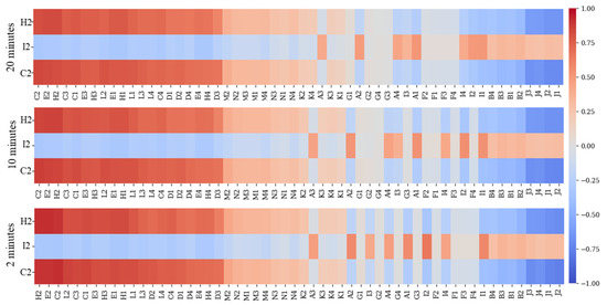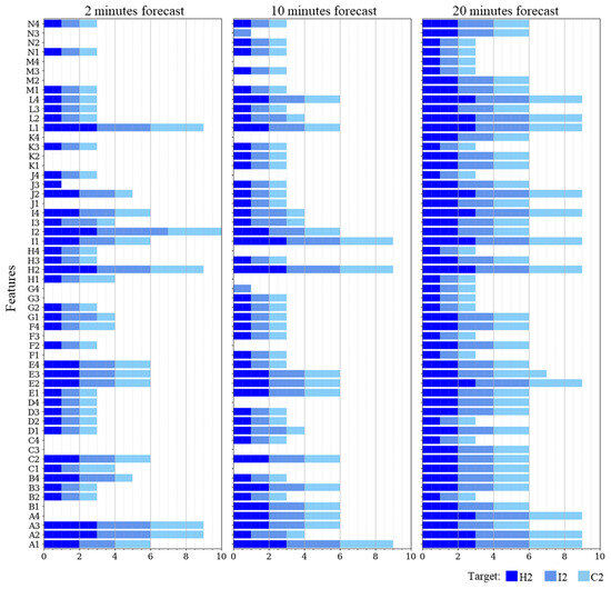 In Figure 8, it is noteworthy that overall, nine features were selected more than 20 times (I2, I1, H2, A3, A2, A1, C2, L1, I4), and seven other features were selected more than 15 times (E2, L4, J2, E4, E3, L2, L3). The most selected feature, with 24 occurrences, was I2, while the least selected, with four incidences, was H4. The control set of features contained 12 features for each target and nowcasted time, while the group with all features contained 56. The mRMR and XGBoost methods each selected ten features for every target and projected time. When considering the two-minute nowcast, the GA method’s feature selection varied depending on the target: 26 for H2, 27 for I2, and 28 for C2. In the case of the ten-minute nowcast, the feature selections for each respective target were 30, 26, and 28, respectively. Lastly, the chosen features numbered 32, 26, and 35, respectively, for the most extended nowcast period. In a similar pattern, RFECV opted for 12, 14, and 12 features, respectively, for the first set, and 11, 14, and 18, respectively, for the second set. For the longest prediction interval, it utilized nearly all the features, specifically 55, 55, and 56. For PCA, the number of features was 20, 20, and 13, respectively, for the 2 min forecast, while it was 14, 22, and 21, respectively, for the 10 min and 21, 20, and 19 for the 20 min prediction, for H2, I2, and C2 target, respectively. It is also renowned that, in general, as the forecasted time increases (from 2 to 20 min), the number of selected features also increases, suggesting that the additional information of the less relevant features becomes progressively more relevant to provide context.