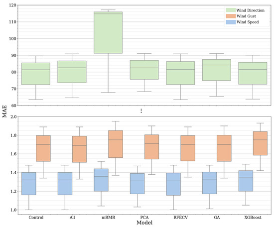 Based on Table 2, Table 3 and Table 4, when forecasting wind speeds and directions, distinct patterns become evident over the different time horizons. For the mean wind speed, the 2 min forecast presents the narrowest discrepancy between methods, with MAE values oscillating between 1.00 (All methods) and 1.05 (XGBoost). Extending the prediction horizon to the 10 min forecast reveals that mRMR exhibits the most substantial deviation, with an MAE of 1.36, while RFECV registers the lowest error at 1.31. At the 20 min mark, the variations are more pronounced, with values spanning from 1.46 (PCA) to 1.52 (mRMR). For the wind direction mean, the 2 min forecast sees MAE values ranging from 63.53 (RFECV) to 68.26 (PCA). This discrepancy broadens at the 10 min forecast, with RFECV at the lower end registering an MAE of 81.30, and mRMR at the top with a significant 114.68. This trend persists into the 20 min forecast, where MAE values fluctuate between 89.58 (control) and 117.10 (mRMR). Lastly, for the wind gust, the 2 min predictions range between 1.33 (all method) and 1.42 (XGBoost). For the 10 min forecast, RFECV shows the least MSE at 1.70, while mRMR records an error of 1.75. For the 20 min predictions, the error for mRMR peaks at 1.95, contrasting with the all method’s more modest 1.89. Overall, predictions for wind speed are relatively consistent across the methods implemented, but predictions for wind direction exhibit more variability as the forecasting window extends.