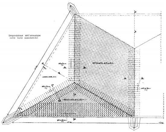 Musmeci triangular parabolic cross vault: reinforcement layout, reproduced from reference [1].