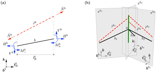 representing the horizontal and vertical components of the internal resultant force, and the bending moment at the beam mid-section, respectively. For a visualization, it is observed that such a stress state is statically equivalent to a thrust force along a suitable straight line (Figure 5a). Accordingly, the beam equilibrium implies that the resultant forces and moments at the beam end-sections (with positive or negative sign prevailing for the initial or final section, respectively) are given by: