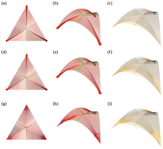 Structural analysis of the Musmeci vault reinvented as a masonry structure: generalized thrust network in (left) plan and (mid) perspective views, and (right) settlement mechanism of minimum thrust, assuming a uniform normalized thickness . The network shape parameter is selected as (a–c) , (d–f) , and (g–i) . The network refinement parameter is set to .
