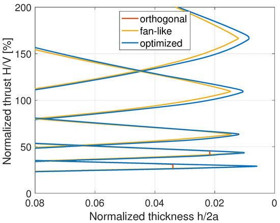As proposed in reference [17], the minimum and maximum thrusts are explored, resulting from outward or inward horizontal settlements in the rib planes at the corner supports, respectively. In Figure 8, the normalized thrust values, and are reported versus the normalized thickness , for the selected values of the rise-to-span ratio. Red, yellow, and blue curves correspond to orthogonal (), fan-like (), and optimized () beam networks, respectively. As expected, an increase in implies a general decrease in the thrust regime, with the optimized network shape parameter shifting from to while considering vaults that are more and more slender. Moreover, an increase in implies a larger interval of admissible thrusts for the vault, to be interpreted as an increase in the vault robustness.