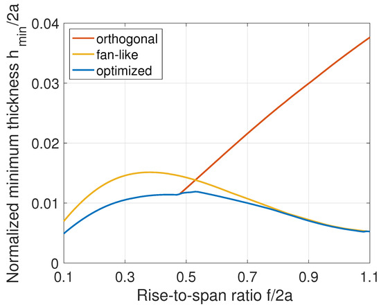 A parametric analysis of the minimum thickness of the vault, with respect to the rise-to-span ratio , is then performed. The relevant results are shown in Figure 9, where the estimates obtained using the orthogonal, fan-like, and optimized networks of beams are compared. It is observed that the optimized minimum thickness versus rise-to-span ratio curve is characterized by two branches. The first [resp., second] branch, corresponding to shallow [resp., slender] vaults, is increasing [resp., decreasing] and attained with an orthogonal [resp., fan-like] network topology. The transition between the two branches takes place for vaults with intermediate values of and requires intermediate values of the network shape parameter . In particular, a maximum of the curve is observed within such a connection branch, implying that the geometric safety factor of triangular parabolic masonry cross vaults under self-weight improves when considering shallow or slender geometries.