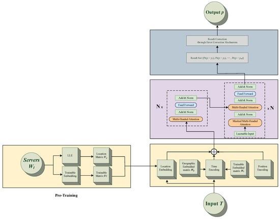 The LTransformer consists of four modules: the pre-training module, the input module, the encoding–decoding module, and the output module. The LTransformer uses the Transformer framework in general, and improves on the original Transformer by improving the input module and adding the pre-training and the output modules. In the pre-training module, stationary latitude and longitude data are embedded into the multidimensional space. There are three aspects considered in the input module, which are location, position, and time. In the location aspect, we use trainable embedding and local linear embedding (LLE). In the position aspect, we combine the trajectories with their serial numbers. In the time aspect, we add temporal information using the method in Informer [23]. In the output module, this paper proposes an error correction mechanism to remove the faulty results. The overall framework of the LTransformer is shown in Figure 3.