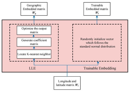 The input of location embedding process is the matrix Ml. It is generated by the results of pre-training process. Specifically, two embedded matrices, Mt and Mg, are generated by replacing the serial numbers in Ml with the corresponding embedded vectors in the trainable embedded matrix Wt and the geographic embedded matrix Wg, where . Finally, the matrix Mt and the matrix Mg are summed by weights to obtain the matrix ML, which represents the location information.